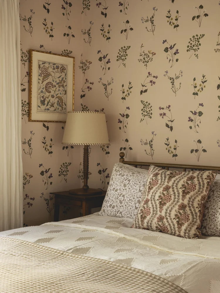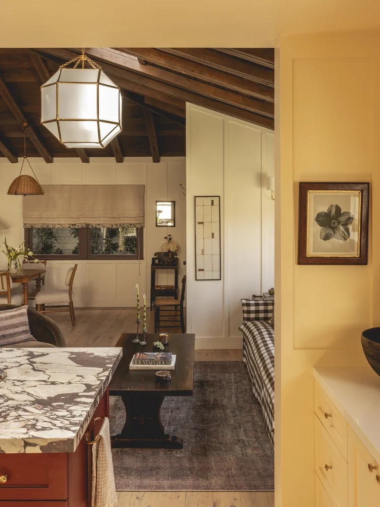 Nestled near the beach in Los Angeles, this charming 1940s clapboard cottage was transformed into a cozy yet contemporary retreat. By exposing the original timber ceiling and staining it a rich, dark hue, the space instantly gained warmth and architectural interest. Classic wall paneling was added to enhance depth and character throughout the home. In the kitchen, a soft yellow palette brings a cheerful, retro-modern vibe, striking a balance between nostalgia and freshness. Carefully curated antique furniture and artwork add soul and sophistication, while a gingham sofa and layers of floral patterns create a relaxed, bohemian cottage atmosphere, effortlessly blending vintage charm with a fresh, artistic spirit.
