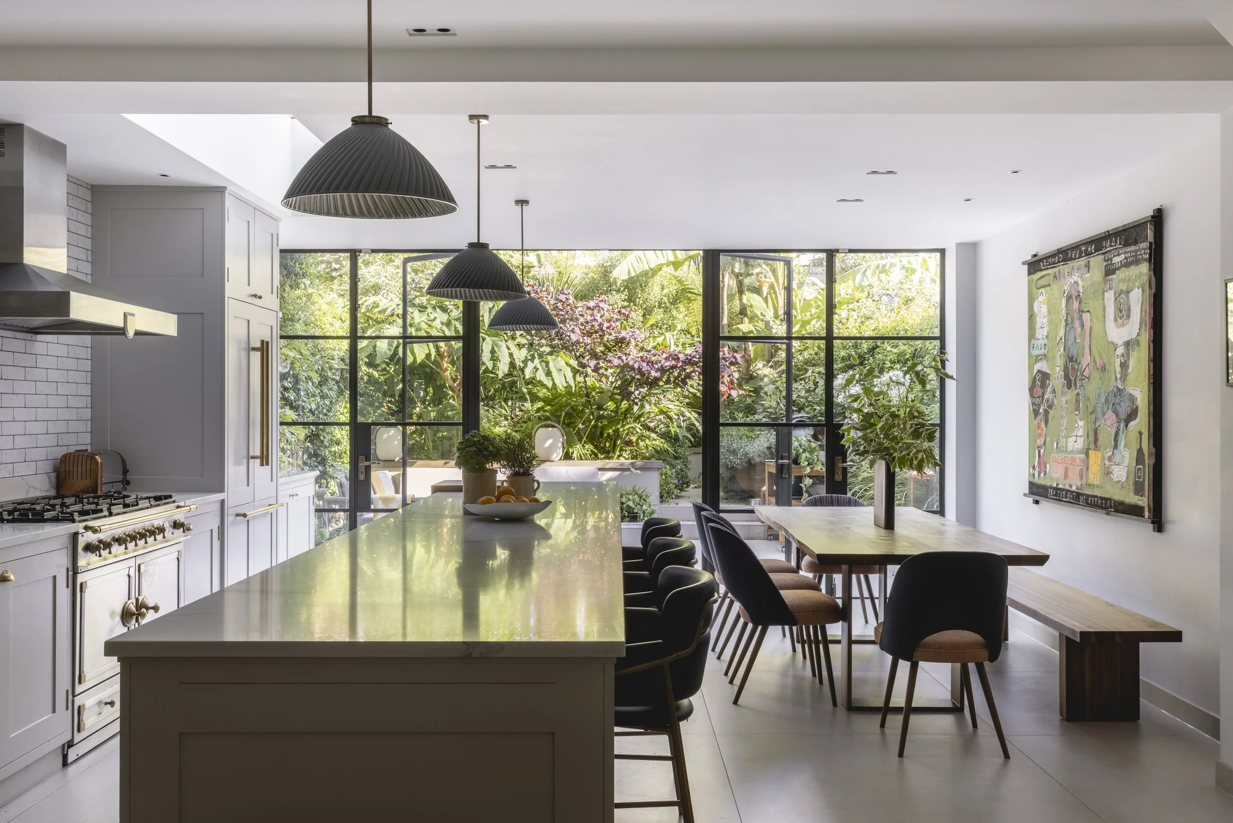 A private home for a young art dealer, this five-storey Chelsea townhouse was reimagined as a light-filled sanctuary with space to grow into. Behind its traditional façade, bespoke carpentry, custom steel-framed doors and soft, refined materials shape a calm and characterful interior. In the master suite, limed oak panelled walls conceal generous storage to create a space that feels both tailored and serene. At the rear, a wild leafy garden brings a sense of retreat to everyday city living.