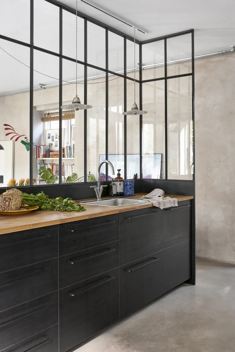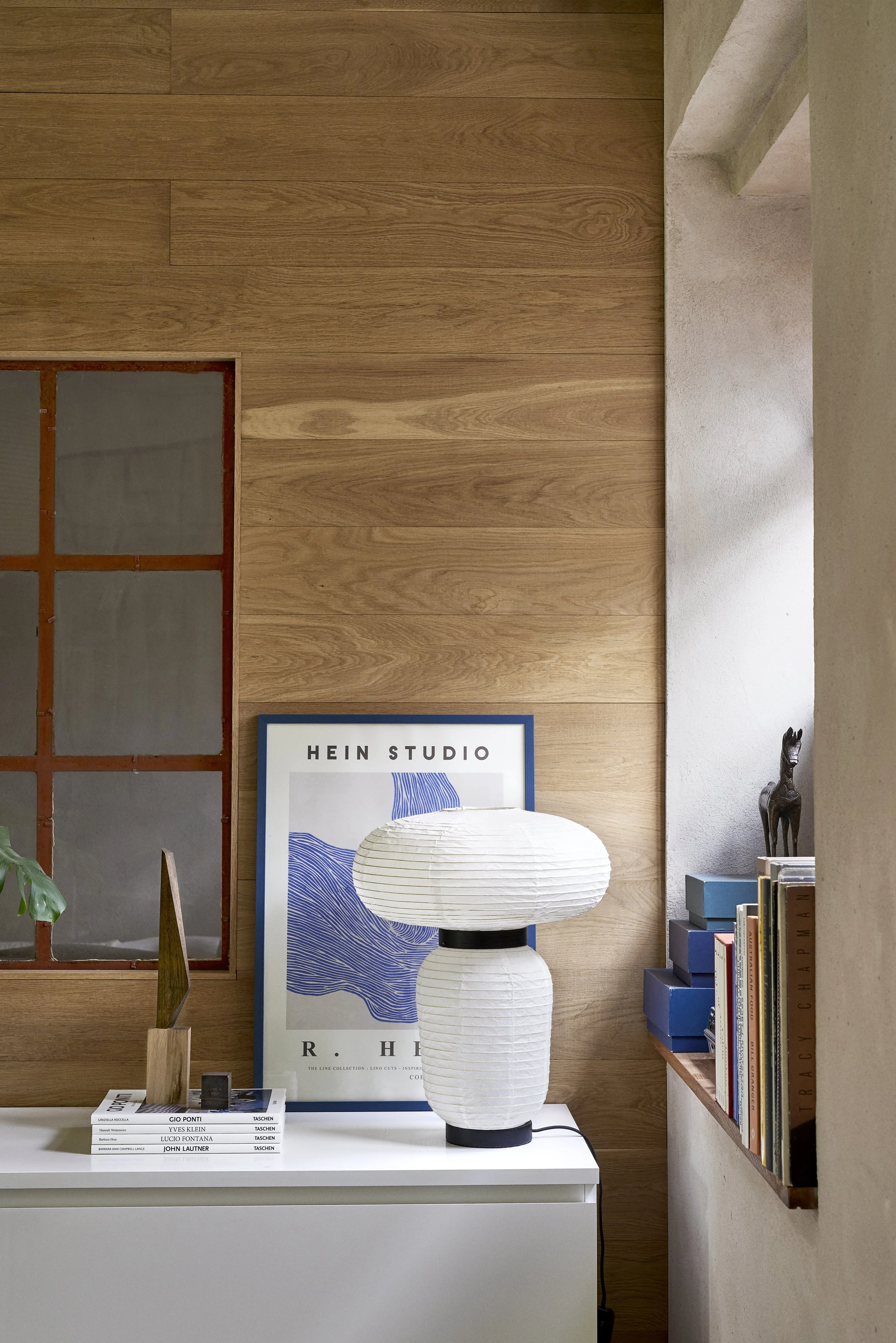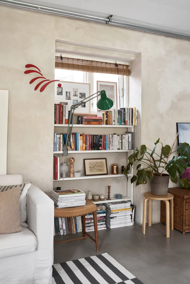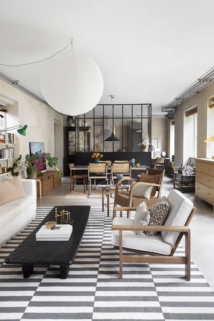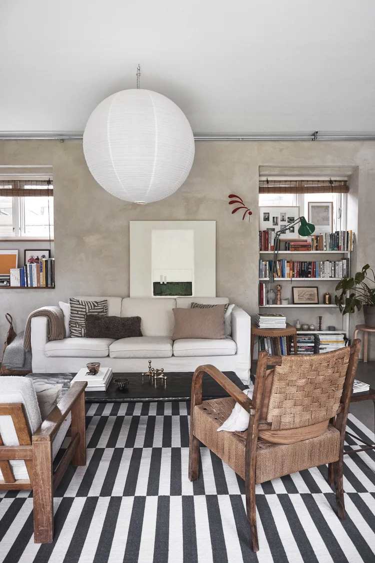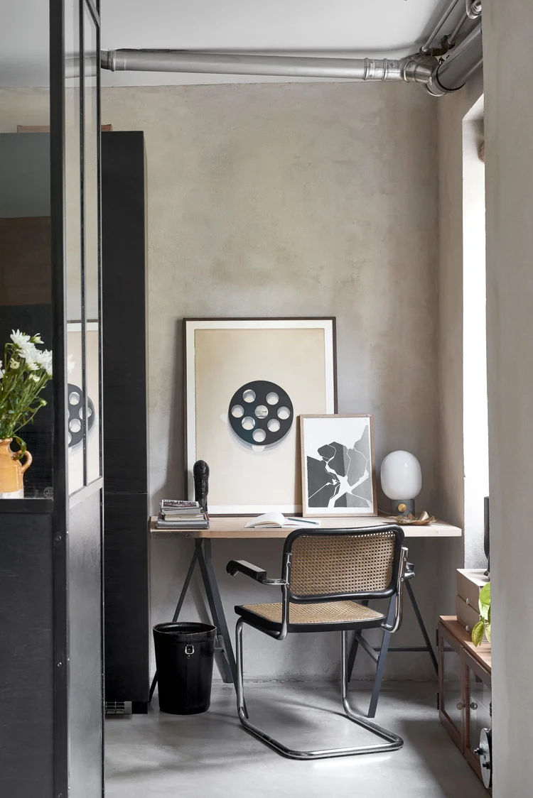 In a quiet pocket of Copenhagen, this apartment strips things back without losing its soul. Lime-washed walls and poured concrete floors set the tone: earthy, elemental, quietly confident. A black steel-framed kitchen nods to industrial precision, but the mood is softened by pieces with history; bentwood chairs, woven textures, framed fragments of art and life. It is a home that does not try too hard, and that is exactly the point. Every detail feels intentional but never forced, a lived-in mix of form, function and personality.