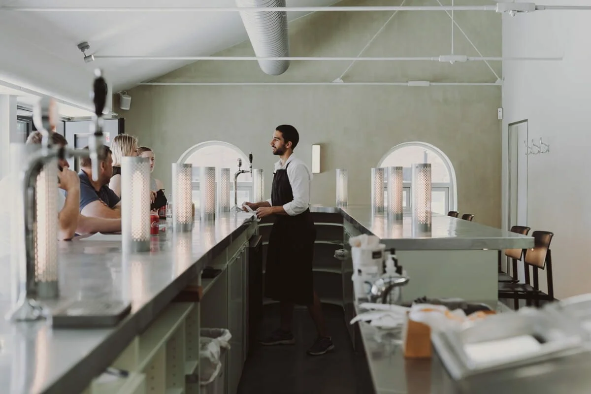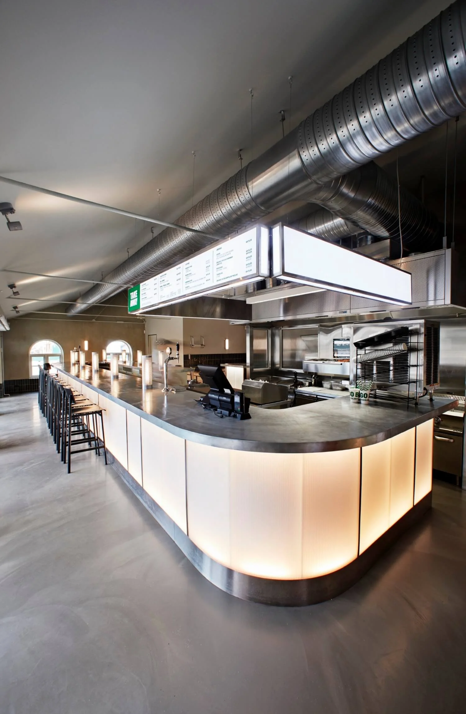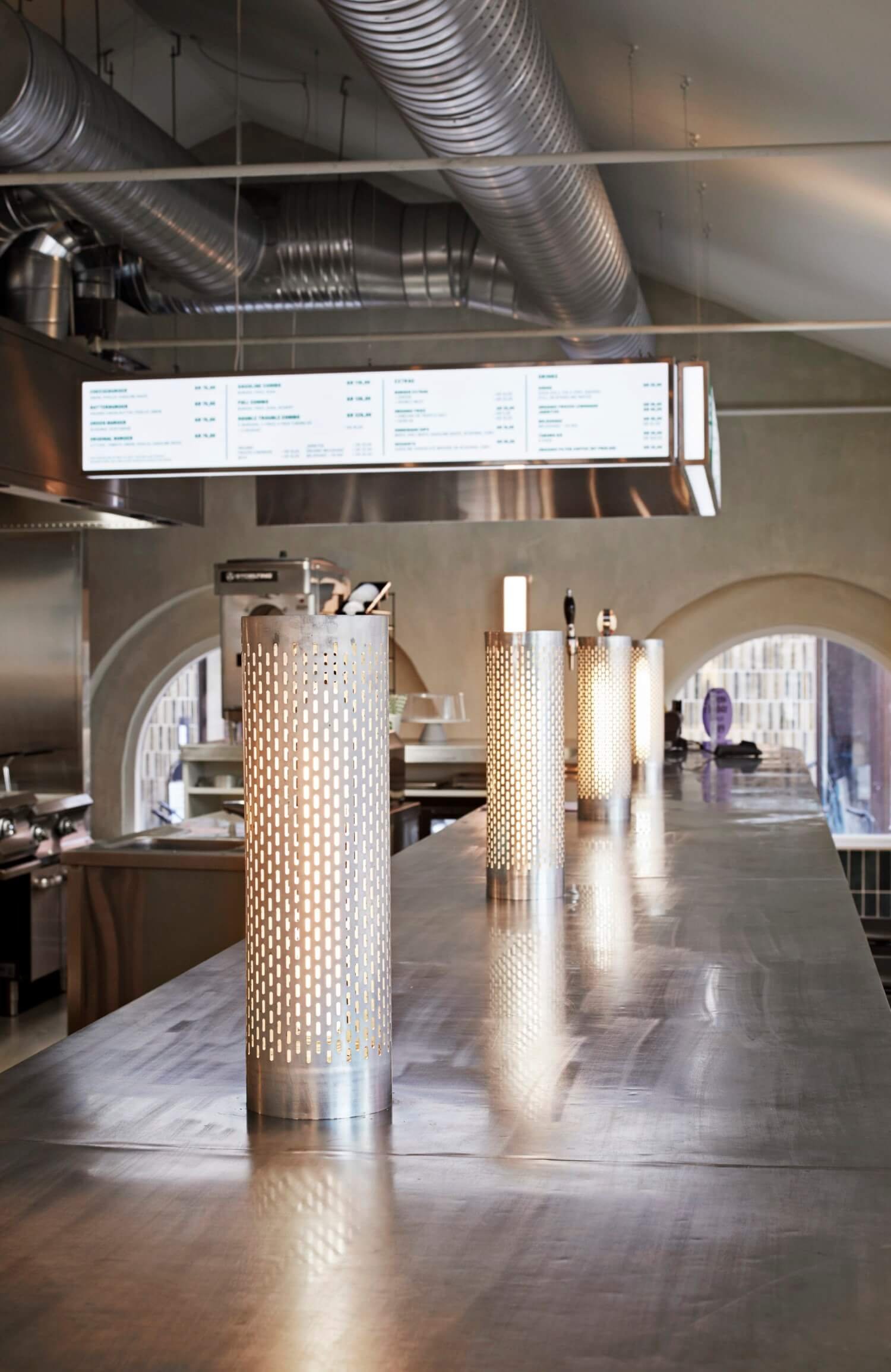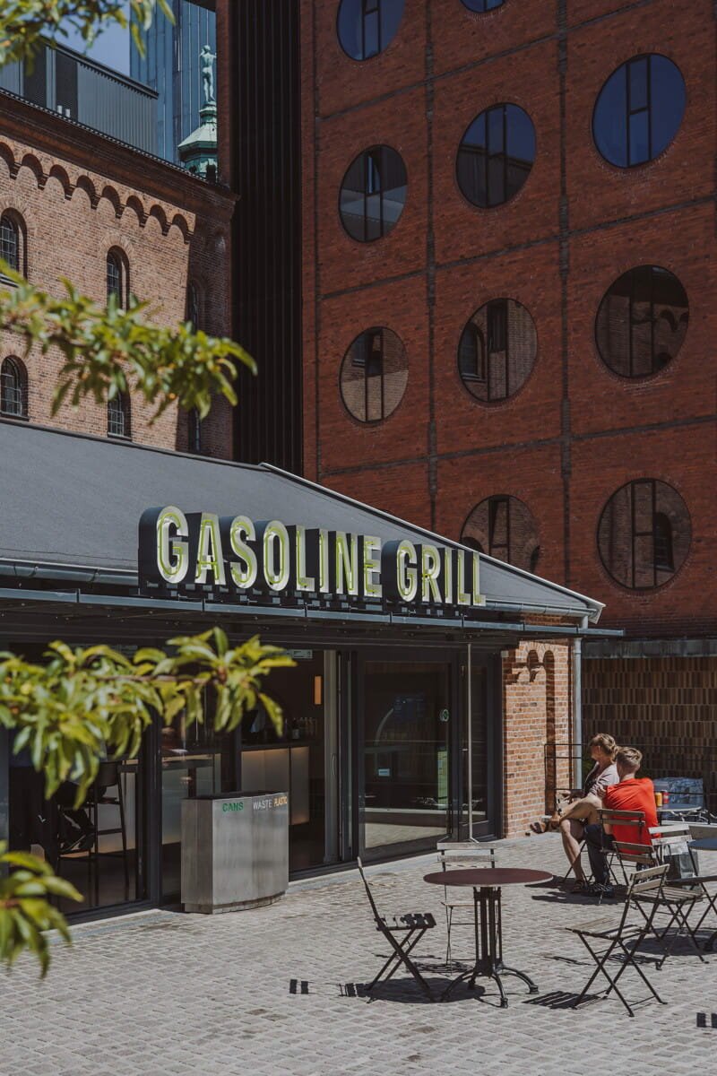 Gasoline Grill in Carlsberg Byen occupies a refurbished brick structure set at the centre of a granite-cobbled square. Designed in collaboration with Briq Architects in Copenhagen, the space embraces its industrial bones open plan with exposed steel tie beams that allowed for a long custom zinc-topped counter, a modern nod to the classic diner. Limewashed walls soften the interior, while custom metal table lamps fixed to the bar and a backlit polycarbonate frontage create a warm evening glow and an affordable solution for a large-scale counter. In summer, bifold doors open fully to let the energy spill out into the square.