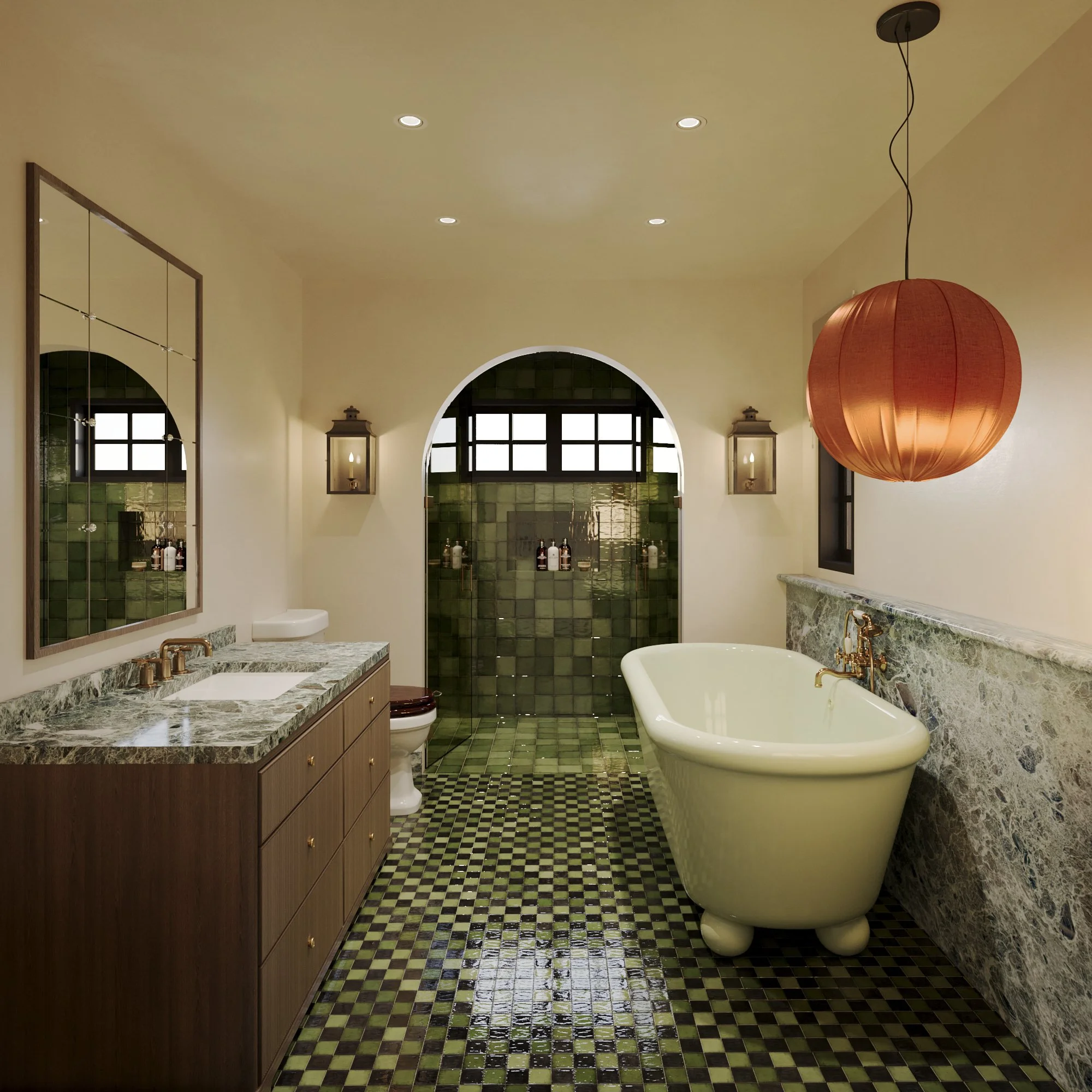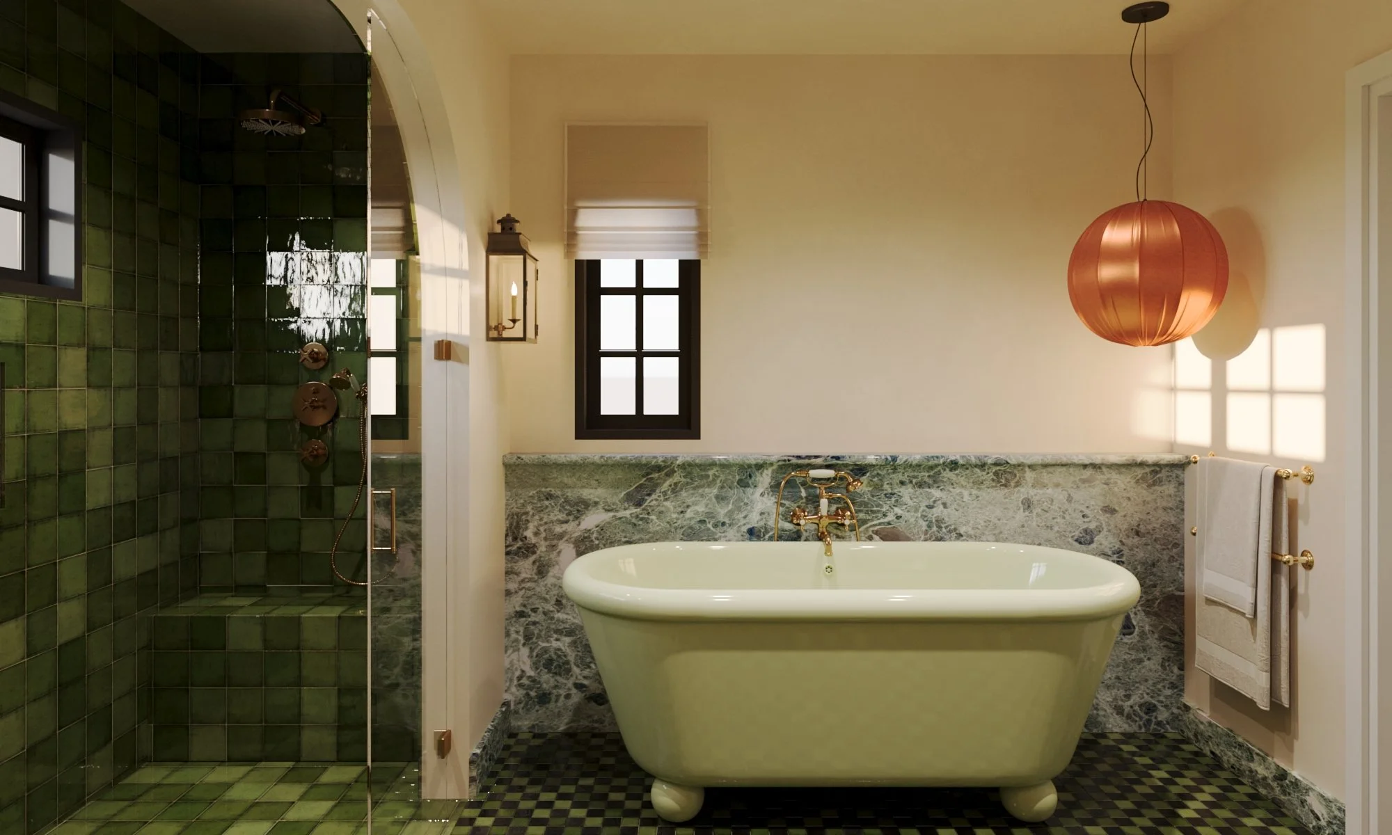 The primary bathroom draws on the client’s love of Morocco, with deep green tiles and marble creating a calm, layered atmosphere. A Water Monopoly bath sits at the centre, paired with antique brass fittings and softly glowing vintage lights. The fully tiled shower adds a sense of enclosure and continuity, turning the space into a serene retreat that feels both grounded and quietly luxurious.