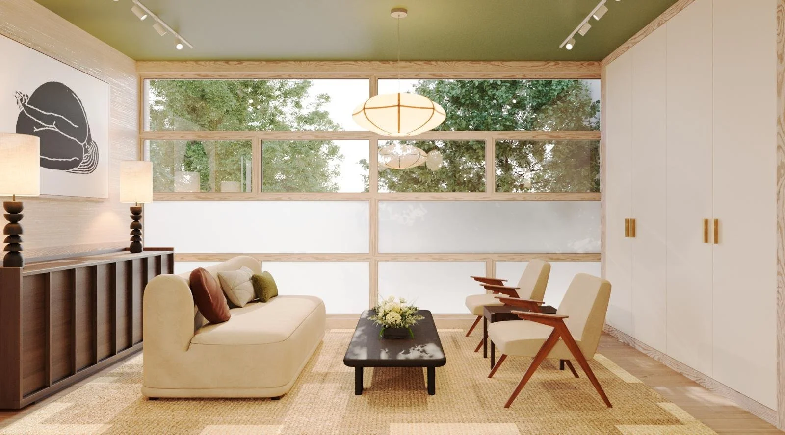 A view across the living room space - natural tones and materials.